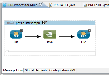 Mule provides a number of endpoints which can be used for input and output as well as transformers that can modify those inputs (or “messages”). This flow uses a file end point to watch a folder. When a .pdf file is added to the folder, it is transmitted as an input stream to our Java component. jPDFProcess then converts the PDF document to a TIFF image and writes the TIFF image to a byte array. This is transmitted to the flow’s file endpoint which writes the TIFF file to the specified directory as out.tiff.
