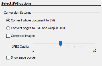 The Convert To HTML5 tab allows the user to set options when converting a PDF document to either an SVG document or an HTML wrapped around the SVG.
