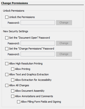 The Change Permissions Job is used to set the permission settings of a PDF file. This wizard allows you to set the following options for the permissions.