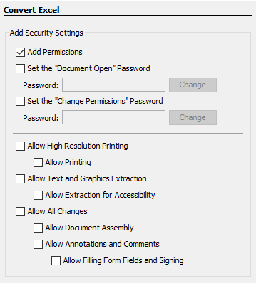 The Convert Excel to PDF job allows to convert Microsoft® Excel documents to PDF. The basic wizard options allow to set the security options on the output PDF document.