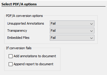 Use this section to set the settings to apply when the conversion of the document to PDF/A fails: