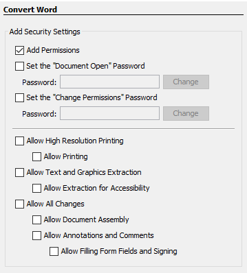 The Convert Word to PDF job allows to convert Microsoft® Word documents to PDF. The basic wizard options allow to set the security options on the output PDF document.