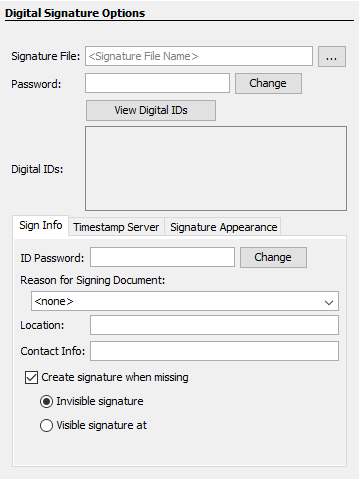 Signature File - The full path to the Digital ID file used in the signature on the server. Accepted formats are .p12 & .pfx.