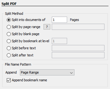 Append bookmark name - This option is only available when the "Split by bookmarks" option is selected. This will append the name of the starting bookmark to the output documents names. So for instance if "Cover Page" is the first bookmark name, the first output document will could be named test_p1-p1_CoverPage.pdf. Only letters, numbers, hyphen and underscore characters are preserved in the bookmark name to guarantee that all operating systems will accept this file name. Commas are replaced with an underscore.