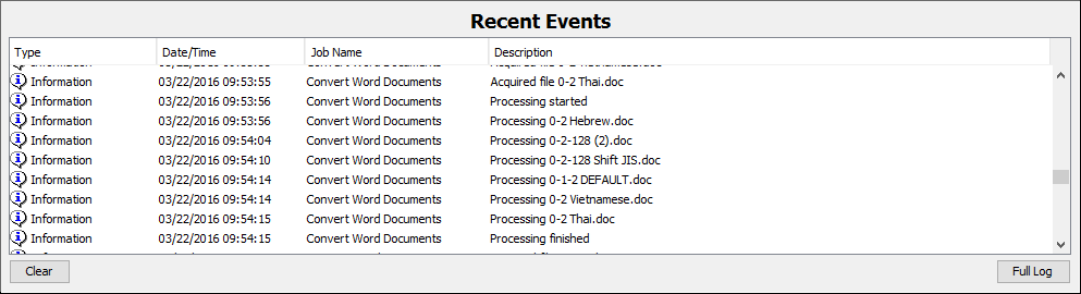 The log contains three types of messages associated with each event. To see additional details double click on the event.